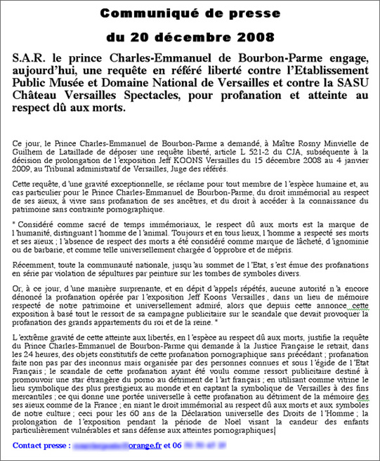 Dans un communiqué non signé (lire ci-dessous) qu’on peut supposer émaner de la « Coordination de défense de Versailles » animée par Arnaud-Aaron Upinsky, on nous fait savoir que M. de Bourbon-Parme « a demandé, à Maître Rosny Minvielle de Guilhem de Lataillade de déposer une requête liberté, article L 521-2 du CJA, subséquente à la décision de prolongation de l’exposition Jeff KOONS Versailles du 15 décembre 2008 au 4 janvier 2009, au Tribunal administratif de Versailles, Juge des référés. »