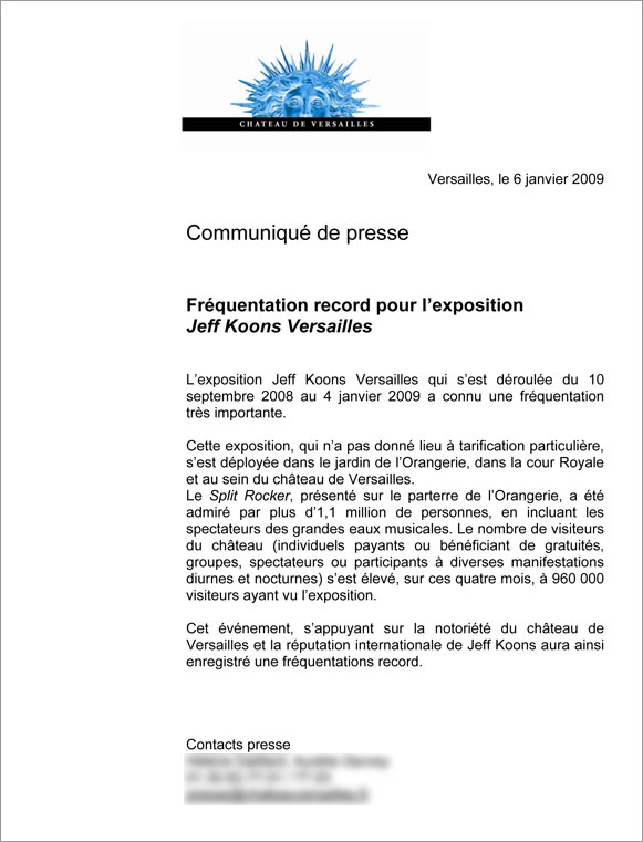 [1] « L’exposition Koons dope les entrées à Versailles » par Nathaniel Herzberg et Michel Guerrin, LE MONDE | 26.12.08 ; « Le public au rendez-vous de la »révolution« Koons à Versailles » par Elizabeth Pineau, REUTERS | 15.09.08 ; « Fréquentation record pour l’exposition Jeff Koons Versailles », communiqué de presse du château de Versailles | 06.01.09.