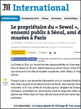 12.06.14, 12h | NOUVELLE VERSION - Mercredi 11 juin au soir, j’ai reçu un mail de Christophe Ayad, rédacteur en chef du service International du Monde, me disant avoir pris connaissance de la précédente version de ce post daté du 10 juin, où je m’étonnais – en des termes que je ne peux citer ici sous peine de me voir à nouveau bashé - de ne pas avoir été cité pour la partie française concernant le domaine culturel, dans l’enquête que le grand quotidien consacrait enfin à Yoo Byung-eun alias Ahae depuis le naufrage du Sewol en Corée du Sud, soit près de deux mois plus tôt : « Le propriétaire du Sewol, ennemi public à Séoul, ami des musées à Paris » de Jacques Follorou et Philippe Mesmer (à Séoul, envoyé spécial).