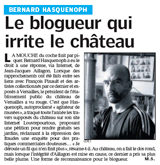 Un des rares journalistes de presse écrite à avoir suivi nos actions concernant le domaine de Versailles travaillait au Parisien Yvelines, un média de proximité extrêmement lu. Il prenait en compte de temps en temps nos communiqués, les répercutait dans ses articles, toujours avec un regard critique, les confrontant à la parole officielle du Château. Un vrai travail de journaliste. Franchit-il les limites quand, dans une édition de fin d’année, il réussit à nous imposer parmi les 10 personnalités marquantes des Yvelines !? La nouvelle ne fut pas du goût de tout le monde, en tous cas pas du blog versaillo-versaillais