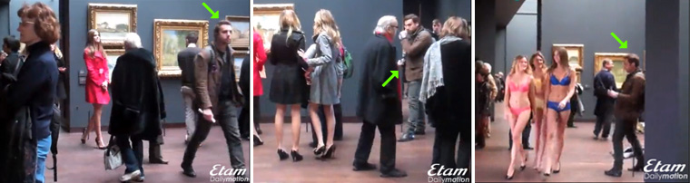 De la même façon, nous ne reprochons aucunement aux agents de surveillance un quelconque manque de professionnalisme dans cette affaire - on aura noté l’hommage appuyé de M. Cogeval en ce sens - puisque, le jour du tournage, certainement en raison d’un sous-effectif de personnel, il n’y avait - on nous l’a confirmé en interne -, aucun gardien dans les deux salles où les mannequins d’Etam ont enlevé leurs imperméables et déambulé sous l’oeil de caméras clandestines. On le voit bien sur la vidéo et c’est certainement pourquoi ces salles ont été choisies. Le droit de réponse affirme que le tournage a été réalisé en caméra cachée. Un examen attentif de la vidéo tendrait à prouver le contraire. La scène centrale est montée en champ-contrechamp ayant nécessité la présence de plusieurs personnes pour filmer. Or on identifie parfaitement deux individus dont la position dans l’espace correspond à plusieurs images retenues dans le montage. Aucun des deux ne se cache pour filmer (voir photos ci-dessous et vidéo en ligne).