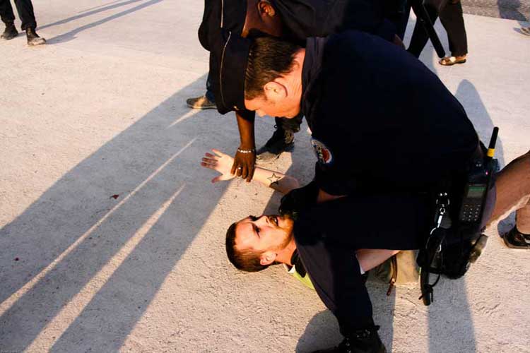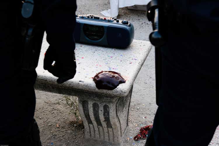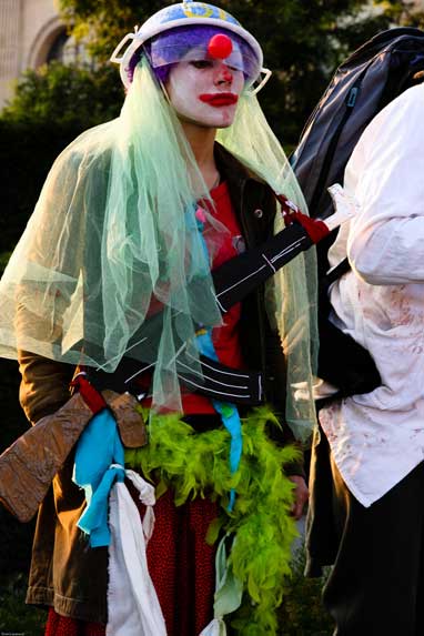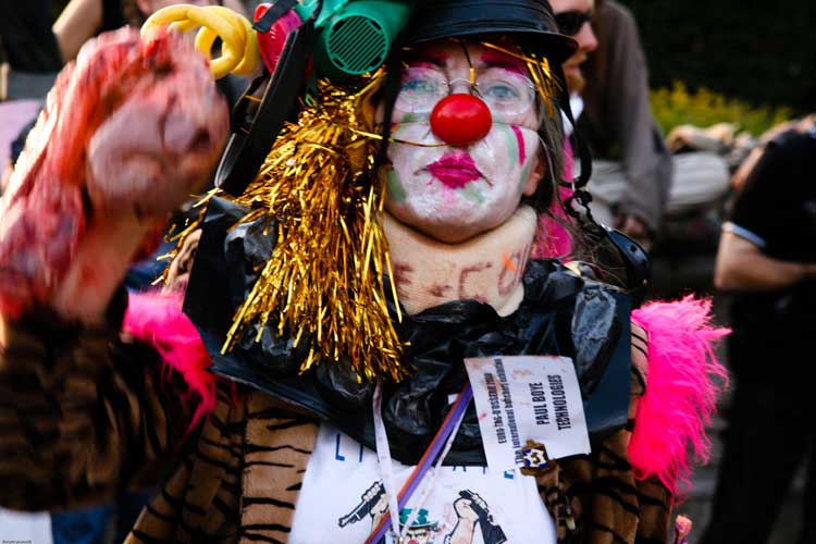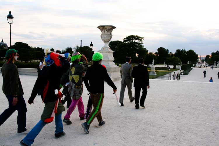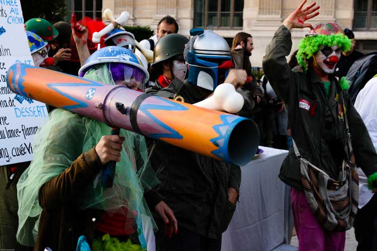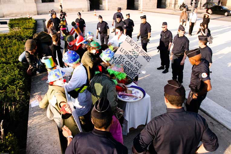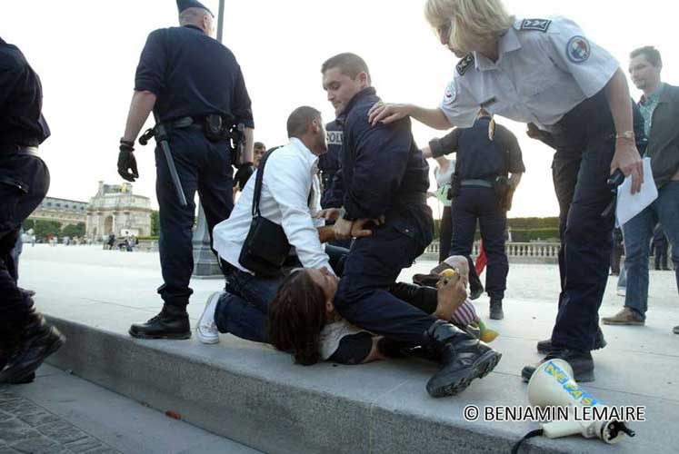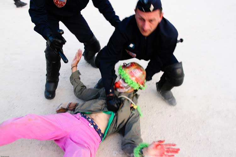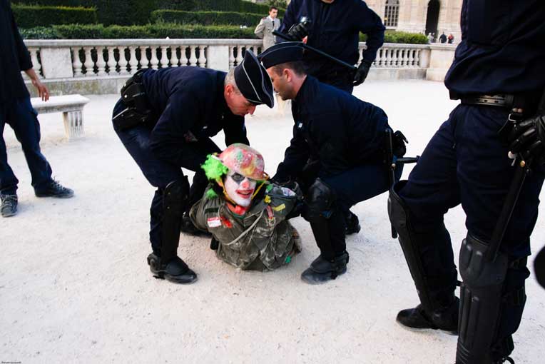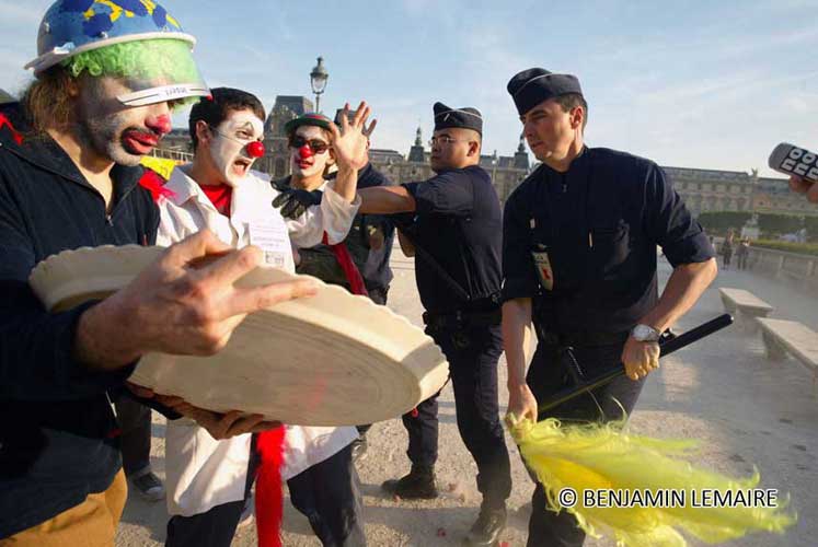 La manifestation post-dadaïste - celle du dehors - a, semble-t-il, mis les forces de l’ordre particulièrement sur les dents. Selon plusieurs témoins, plusieurs journalistes ont été refoulés sans ménagement, un photographe de presse a été frappé quand des militants un peu trop expansifs ont été plaqués au sol, molestés, menottés et embarqués sous l’oeil de touristes médusés [2]. Quand ils rentreront dans leur pays, ils pourront dire « En France, on frappe les clowns ! ».
