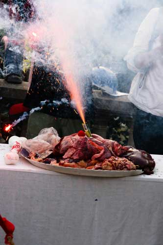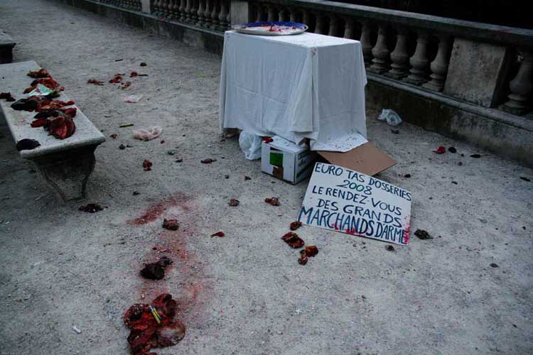 20.06.08 | IRAKIEN À LA SAUCE GRENADE, Salade d’abats civils, Croustillant de peau brûlée à l’afghane« , ce sont quelques uns des plats du menu du »grand banquet cannibale« proposé par la Brigade Activiste des Clowns - la BAC, spécialisée dans les happenings artistiques militants - pour protester contre l’autre banquet, celui des »profiteurs de guerre", qui se tenait au même moment, à quelques dizaines de mètres de là, sous la pyramide du Louvre, en cette belle soirée du 17 juin alors que le soleil de fin d’après-midi caressait les pierres blondes du plus beau musée du monde [1].