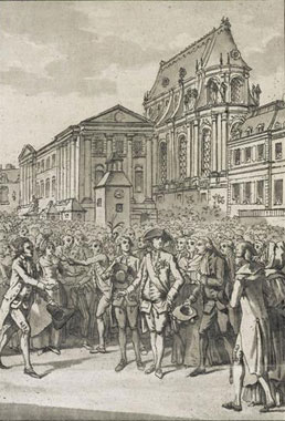 Enfin de quel homme du XVIIIe parle-t-on ? Certainement pas des contemporains de Louis XVI qui, en près de vingt ans de règne, n’auront jamais connu la grille Royale visible désormais par les touristes du XXIe siècle. L’hémicycle nord, soit un tiers de l’ensemble de la grille, fut démontée en 1771, pour être remplacée, faute d’être remontée après la construction du nouveau pavillon Gabriel, par une simple palissade de bois. Deux baraques en moellon, aux toits pointus, construites pour abriter l’une des gardes, l’autre des bureaux, s’y adossèrent quand une troisième plus élevée surmontée d’un clocheton fut construite plus en avant pour intégrer l’horloge du bâtiment disparu. C’est cet état qui devait perdurer jusqu’à la Révolution où l’on finit par supprimer la totalité en 1794. Anecdote historique intéressante, l’invasion du palais par le peuple parisien en révolte, le 6 octobre 1789, a pu été facilitée par cette configuration facilement franchissable [17].