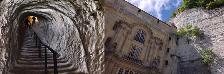 L’exposition s’attache évidemment à décortiquer la part d’intervention d’Hubert Robert dans le jardin anglais du château de La Roche-Guyon qui vaut à lui seul le déplacement, tellement sa configuration architecturale est étrange. De loin, il n’est pourtant pas fameux ce château, hétéroclite et sans harmonie. Mais sa visite est extraordinaire, bien qu’il ait été, hélas, vidé de tout son mobilier en 1987, lors d’une vente organisée par les La Rochefoucauld, toujours propriétaires, qui confièrent ensuite la gestion du monument au département du Val-d’Oise via un bail emphytéotique. La surprise vient du fait que le château soit encastré dans une falaise de craie. Jusqu’au XIIème siècle, il était même totalement troglodytique. Une traversée des salons XVIIIème, où se tient l’expo, de la bibliothèque au triste vide des étagères comblé par de faux livres blancs, nous amène, après un passage par les chapelles troglodytiques, jusqu’à un boyau creusé à même la roche, à l’air libre puis souterrain [6]. Après une montée vertigineuse, on débouche au pied du donjon en ruine, qui, depuis la fin du XIIème siècle, domine le paysage. A son sommet, on a une vue magnifique sur la vallée de Seine d’où on peut admirer, au pied du château de l’autre côté de la route, le splendide potager-fruitier restauré qui se visite librement.