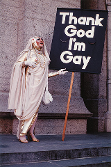 Une activité commerciale qui justifie un positionnement original en terme de mécénat, puisque Gilead soutient non seulement « des actions qui favorisent la prévention, améliorent l’accès aux soins des patients les plus vulnérables et accompagnent les patients dans leurs parcours avec la maladie » mais aussi « des organisations qui œuvrent pour lutter contre les idées reçues, la stigmatisation et la discrimination ». D’où le soutien, en France, à des associations comme Act Up-Paris ou AIDES (ce qui n’empêche pas les conflits) et maintenant au Centre Pompidou pour cette campagne d’acquisition d’œuvres, ainsi que pour l’exposition « Over the Rainbow » qui les présente. D’ailleurs, l’iconographie militante liée à la lutte contre le sida y tient une place de choix, pour l’essentiel américaine, notamment du collectif Akimbo qui sévit à San Francisco vers 1990 ou dans les photos des Soeurs de la Perpétuelle Indulgence prises dans les années 1980 par Jean-Baptiste Carhaix, dont l’une constitue le visuel de l’expo. On y voit une Soeur portant une pancarte avec ce slogan indépassable : « Thank God I’m Gay ».