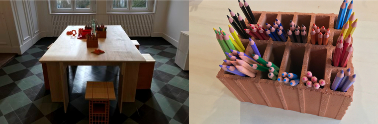 C’est là que se tient l’exposition du moment La Ville au fil de la brique qui espère ouvrir au public dès que possible. Une rencontre fertile entre un philosophe, Christian Godin, des professionnel·les du design et de l’architecture (piKs design & AAPP), et une vingtaine de jeunes des environs, de 15 à 25 ans. L’idée est de concevoir, à partir de leur relation à l’environnement parfois chaotique des villes minières ayant grandi sans grande logique, du mobilier urbain en briques. L’exposition n’est qu’une étape du processus. La première salle, c’est un peu toutes les possibilités d’un matériau vieux comme la civilisation et constitutif du Bassin minier. On y montre son processus de fabrication, les différents types de rendus, histoire de casser la monotonie qui peut lui être associé, et des objets créés par des designers à partir d’éléments recyclés.