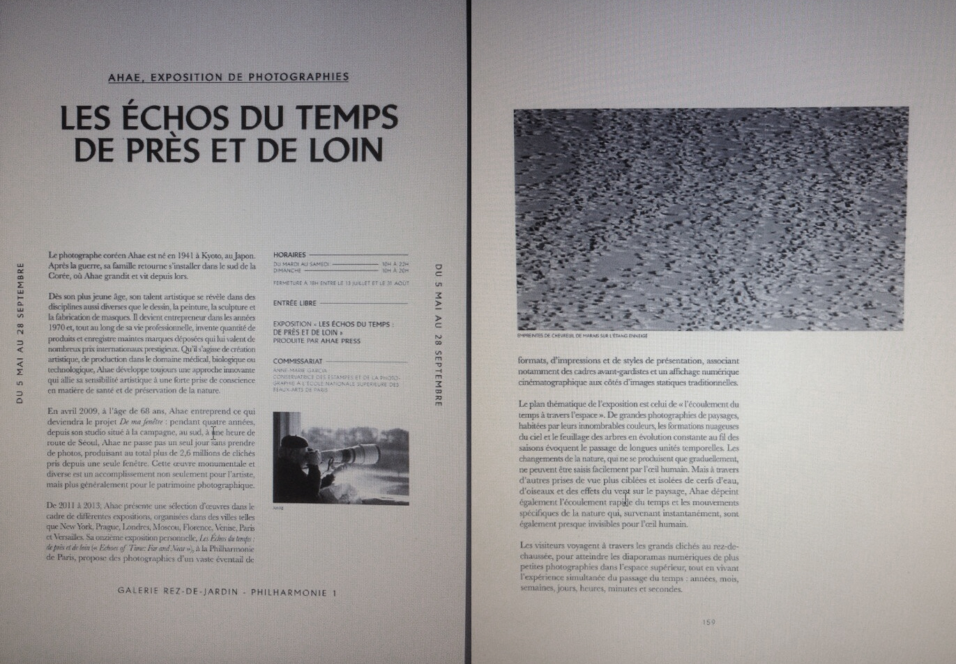 Prévue pour se tenir gratuitement à la galerie rez-de-jardin de la Philharmonie du 5 mai au 28 septembre 2015, l’exposition Ahae sera placée sous le commissariat d’Anne-Marie Garcia, conservatrice des estampes et de la photographie à l’École nationale supérieure des Beaux-Arts de Paris. Celle-ci est connue pour avoir déjà collaboré avec l’artiste milliardaire sud-coréen. On s’en étonnait déjà en 2013 vu ses grandes compétences et l’intérêt de photos plutôt banales, lors de l’exposition Ahae du Château de Versailles, succédant à celle du musée du Louvre dans le Jardin des Tuileries en 2012.