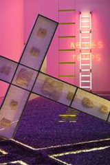 Chaque salle nous invite à vivre des expériences non seulement contemplatives mais aussi sensorielles - Entrez dans La Fabrique de la mémoire toute de miroirs, et pas seulement pour faire un selfie comme moi - ou d’exercice mental. Là une grande croix tombée au sol projetant une ombre lumineuse, là une échelle de néons roses masquant l’inscription Abimes du temps quand dans la même pièce est projeté le dernier film réalisé par le fils du couple, Alain-Guillaume, mort prématurément. Le réel rejoint la fiction. Vanité, tout est vanité. La dernière salle, presque plongée dans l’obscurité, est peut-être la plus belle avec Domus Aurea : un ensemble de maquettes gris-noir, un paysage de ruines en charbon de bois, immergé dans un bassin d’eau.