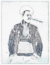 JÉRÉMY DEMESTER | 33 ENGRAVINGS FOR BENJI’S REVENGE - Etrangement, là aussi on retrouve une référence à la Mésopotamie, avec le dessin d’un taureau ailé assyrien. La première exposition dans un musée de Jérémy Demester, artiste pas encore trentenaire, présente des gravures « pointillistes », technique à laquelle, peintre plutôt habitué à l’abstraction, il s’essaie depuis peu. Avec réussite, puisque le septième Prix des Partenaires parrainé par le musée - qui a pour vocation de défendre le travail d’un jeune artiste des arts graphiques vivant en France -, lui a été attribué pour le début de cette série. Revendiquant ses origines gitanes, il garde un goût prononcé pour l’ésotérisme. Ses gravures seraient comme les cartes d’un tarot aux illustrations piochées dans un imaginaire collectif très vaste, créant des correspondances invisibles qu’il nous laisse découvrir : gitan, christ, vierge, chat, squelette, figures allégoriques... Certaines d’entre elles sont agrandies au format toile, en impression numérique. Dans toutes, le bleu prédomine, couleur dont il a voulu également recouvrir le sol, pas seulement parce qu’en daltonien - toujours original pour un peintre - c’est celle qui est la plus prégnante dans son oeil, mais surtout pour sa force symbolique immanente.