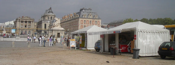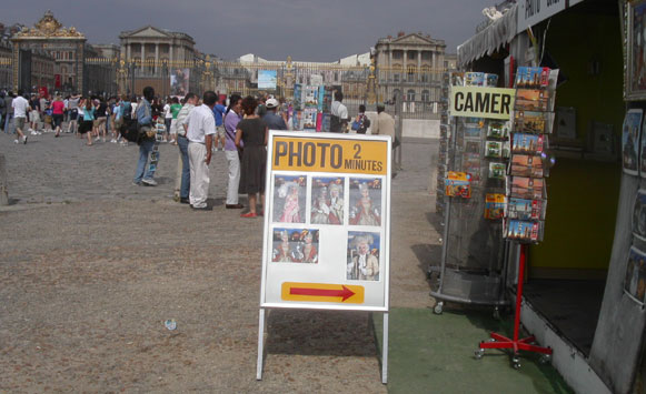 07.04.09 | IL Y A PEU on se réjouissait que Jean-Jacques Aillagon ait mis un frein à la dérive marketing due à Christine Albanel, sa prédécesseure à la tête de l’établissement public. De même qu’on ne peut que le féliciter pour l’aménagement en cours de la place d’Armes grâce à une heureuse entente avec la nouvelle équipe municipale. Elle a déjà permis de débarrasser ce vaste espace qui précède le château des quelques baraques qui l’encombraient dont une boutique de souvenirs qui proposait, comme dans les foires, de tirer le portrait aux touristes en insérant la photo de leur visage dans des personnages en costume Grand Siècle (15€ single, 20€ twin). Très kitsch, très drôle... selon les goûts.