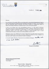 [1] Le maire de Versailles nous a répondu très rapidement, en quinze jours seulement. Sa courtoisie et son sens citoyen tranche avec le mépris de Jean-Jacques Aillagon, président de l’établissement public du château de Versailles, qui n’a jamais daigné répondre à notre lettre du 27 février 2007 qui était, pourtant, tout ce qu’il y a de plus poli.