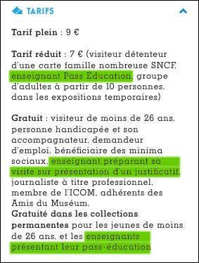 [4] Le site Internet du Muséum indique trois formules tarifaires contradictoires concernant l’accès des enseignants à la Grande Galerie de l’Evolution, comme on peut le voir sur cette capture d’écran (stabilotées par nous en vert). Contactés, ses services nous assurent néanmoins que les enseignants ont bien accès gratuitement avec le Pass éducation.