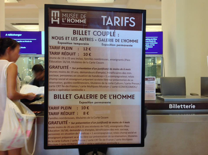 C’était sans compter le musée de l’Homme dépendant du Muséum national d’histoire naturelle (MNHN), établissement sous tutelle du ministère dirigé par Najat Vallaud-Belkacem, qui, depuis sa réouverture en octobre 2015, ne l’applique pas [1]. Pas plus que la gratuité des 18-25 ans instaurée aussi en 2009. Celle-ci n’est accordée qu’aux moins de 12 ans, en totale violation de la loi des Musées de France : « Dans les musées de France relevant de l’Etat, les mineurs de dix-huit ans sont exonérés du droit d’entrée donnant accès aux espaces de présentation des collections permanentes » [2] L’établissement ignore également superbement la gratuité pour tous du premier dimanche du mois. Autant de curiosités pour un musée dont « l’éducation est une des missions constitutive et fondamentale » [3] et qui, par son objet, a plus que jamais un rôle social à jouer, en participant à la lutte contre le racisme et à la prise de conscience de la fragilité de notre planète, comme l’a rappelé le président de la République lors de son inauguration.