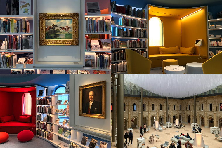 Huit bornes sont à disposition du public, sous forme de tables ou d’écrans, pour explorer les collections numérisées, avec la possibilité de sélectionner des images diffusées ensuite sur des écrans situés en hauteur de la grande galerie du rez-de-chaussée. Plus étonnant, une centaine de tableaux, photographies et objets d’art sont exposés avec cartels comme dans un musée classique, dans des caissons adaptés (sans vitres) intégrés aux étagères ou des vitrines. Pas de manière décorative mais contextualisés. Ainsi l’univers Deauville accueille le public avec un portrait du duc de Morny, fondateur de la ville, accompagné d’une sélection d’ouvrages le concernant. « On peut rentrer dans un sujet à travers plusieurs axes, notamment celui du document ou de l’œuvre. Cela crée plein de possibilités pour le public », explique Caroline Clémensat, directrice générale des Franciscaines qui a suivi le projet depuis sa genèse comme directrice générale adjointe de la Ville de Deauville depuis plus de 15 ans.