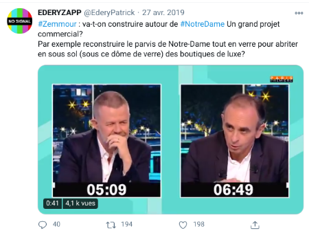 Son post se retrouve ensuite inclus dans un texte anonyme largement partagé sur Internet, insinuant que l’incendie de Notre-Dame n’était pas accidentel et « tomb[ait] à pic pour réaliser le projet futuriste de transformation de l’île de la cité ». Résumé : « Ils veulent remplacer le parvis de notre dame en se contrefichant de l’aspect religieux par une plaque en verre avec des commerces en sous sol (style forum des halles) et des débarcadères depuis la Seine ». Puis les mêmes informations sont délayées en plusieurs articles sur le site complotiste d’extrême droite Résistance républicaine. Dès lors, rien d’étonnant à entendre le chroniqueur Eric Zemmour relayer avec assurance et beaucoup plus d’audience sur Paris Première « les bruits d’un grand projet commercial, genre le Forum des Halles en plus chic » sous le parvis de Notre-Dame. Son acolyte Eric Naulleau s’esclaffe. Pas lui.