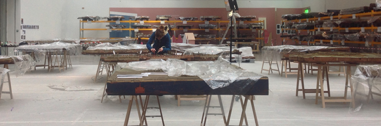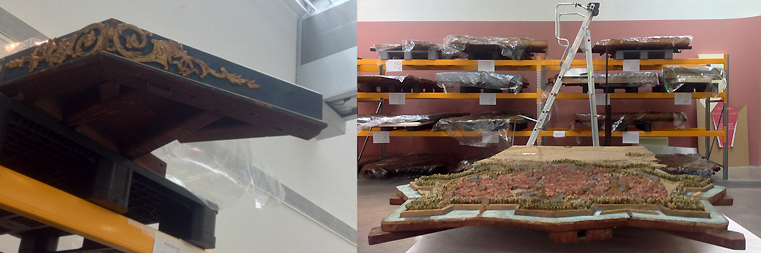 Ce travail délicat aurait pu être mené en cachette, à la mode ancienne, mais le musée a opté pour la transparence, rendant visible le giga atelier-laboratoire depuis des portes vitrées, accessible in vivo en visites guidées (désormais terminées). Et ça valait le coup. On y rencontrait une quinzaine de restauratrices menées par Anne Courcelle. Uniquement des femmes comme souvent dans cette profession, avec, pour en avoir parlé avec quelques-unes, sans doute des raisons socio-économiques à creuser. De différentes spécialités, elles se sont relayé au chevet de ces immenses maquettes de villes fortifiées du nord de l’Europe réduites à l’échelle 1/600ème, de France, Belgique et une des Pays-Bas [1]. Au programme : dépoussiérage et nettoyage (à l’aide d’un mini-aspirateur, de toutes sortes de mini-éponges et de brosses), recollage, refixage, redressement, retouches picturales et consolidation des structures de bois puisque ces maquettes reposent sur des tables pour certaines élégamment ouvragées.
