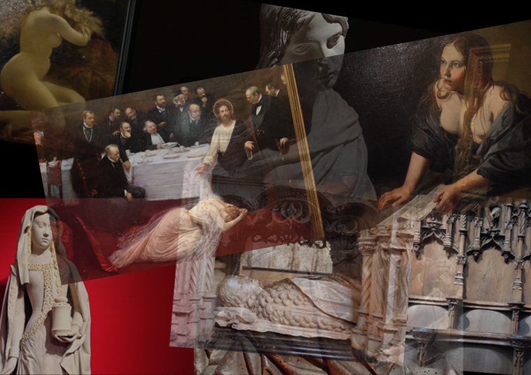 Une sainte qui va s’érotisant de plus en plus à partir du 17e siècle - mais après tout, l’extase mystique n’est-elle pas une sublimation de la libido ? -, pour atteindre un paroxysme bien hypocrite au 19e siècle. D’une peinture de La Lyre, vers 1900, qui nous la montre lascive et totalement nue, un critique de l’époque écrira : « Cette peinture n’a de religieuse que l’étiquette » avec des « formes agréables plus faites pour un boudoir que pour une chapelle » [2]. En effet. Plus généralement et plus actuel, c’est ce qu’évoque Isabelle Renaud-Chamska, diplômée en théologie, que cite le catalogue : « Sous couvert de la pénitence, Marie Madeleine sert d’alibi aux progrès d’un érotisme plus ou moins délicat... On y cherche en vain la repentance » [3]. Pas étonnant non plus que Jean-Jacques Henner l’ait représentée plusieurs fois, de manière beaucoup plus subtile, lui l’amoureux des femmes rousses. Au 20e siècle, on la retrouve même en tenue de bordel Belle Epoque, crucifiée, dans une aquarelle blasphématoire de Gustav Adolf Mossa.