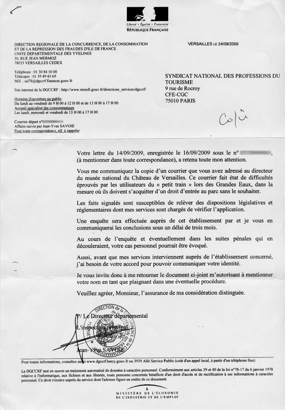 La DCCRF de Versailles, en date du 24 septembre 2009, a retenu la plainte considérant que « les faits signalés sont susceptibles de relever des dispositions législatives et réglementaires ». Dans le courrier adressé au syndicat que nous reproduisons ci-dessous, Jean-Yves Savoie, Inspecteur principal, indique qu’une « enquête sera effectuée » auprès de l’établissement public du Château de Versailles, ses conclusions devant être rendues « sous un délai de trois mois ».
