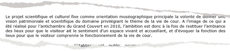 s’accompagne désormais d’opérations de restitution d’ambiance, « pour que le visiteur ait le sentiment d’un espace vivant et accueillant (...) et comprenne le fonctionnement de la vie de cour » explique le contrat de performance. Un choix qui ne fait pas l’unanimité en interne, un conservateur s’étant ainsi exprimé en mai 2011 dans le Journal des Arts sous couvert de l’anonymat : « Le principe est acceptable dans un château privé. Mais il est contestable dans un musée national, où l’on se doit d’être exemplaire en termes de restitution » [10].