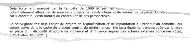 Le contrat de performance évoque dès les premières pages cette question sur le mode du constat : « L’établissement public a constaté et signalé la dégradation progressive du paysage environnant le domaine », insistant sur la nécessité de le préserver « car il constitue l’écrin naturel du château et de ses perspectives ». Mais que peut faire le domaine pour cela ? « Sa sauvegarde fait déjà l’objet de projets de requalification et de replantation à l’intérieur du domaine (...) Elle sera également encouragée par la mise en place d’un dispositif structuré de vigilance et d’influence auprès des acteurs externes concernés (Etat, collectivités, UNESCO…) ». C’est théoriquement rassurant mais ça rend d’autant plus ambigüe l’attitude de M. Aillagon qui, tout en se disant très sensible à la question - elle revient de manière récurrente sur son blog -, s’était déclaré favorable début 2011, en tant que président du Château, au projet d’une implantation de Roland-Garros dans le parc de Versailles. Si cela ne devait pas, selon ses responsables, impacter le paysage, c’était un bien mauvais signal pour la préservation de l’environnement. On sait que la Fédération française de tennis (FFT) ne retint finalement pas cette option. En janvier 2012, la mairie de Versailles souhaitant urbaniser plusieurs parties du parc, Didier Rykner, dans La Tribune de l’Art, notait les contradictions de l’ancien président du domaine dans un livre qu’il publiait sur Versailles, avant que celui-ci ne s’explique, affirmant que son engagement pour Roland-Garros était en fait une manière d’alerter un peu plus sur la nécessité de protéger ce paysage et qu’il y était en réalité opposé. Catherine Pégard, interrogée par Didier Rykner lors de la conférence de presse sur les projets de la mairie, se dit également très attachée à « la protection de la pérennité du domaine royal et celle du paysage ». Mais tout cela reste bien fragile...