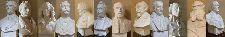 La ferronnerie et les rampes sont magnifiques. Sont comme abandonnées là des vitrines vides, des maquettes, les 24 meubles commandés par Louis 18 pour conserver la collection de minéralogie du comte de Bournon et classés Monuments historiques, les 28 bustes de « grands savants » naturalistes commandés par l’Etat entre 1901 et 1909, stockés durant la Première Guerre mondiale dans les caves du bâtiment avant d’être oubliés, puis redécouverts lors de la rénovation de 1990 et exposés là, certains restant non identifiés. Une ribambelle de naturalistes, zoologistes, botanistes, entomologistes, géologues, minéralogistes, physiciens, médecins... sans une seule femme.